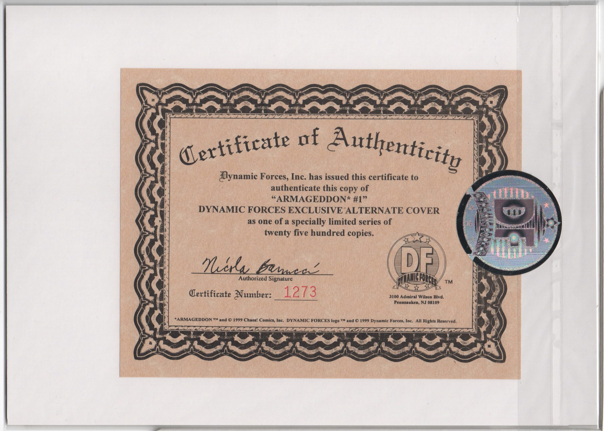 CERTIFICATE OF AUTHENTICITY ISSUED BY DYNAMIC FORCES