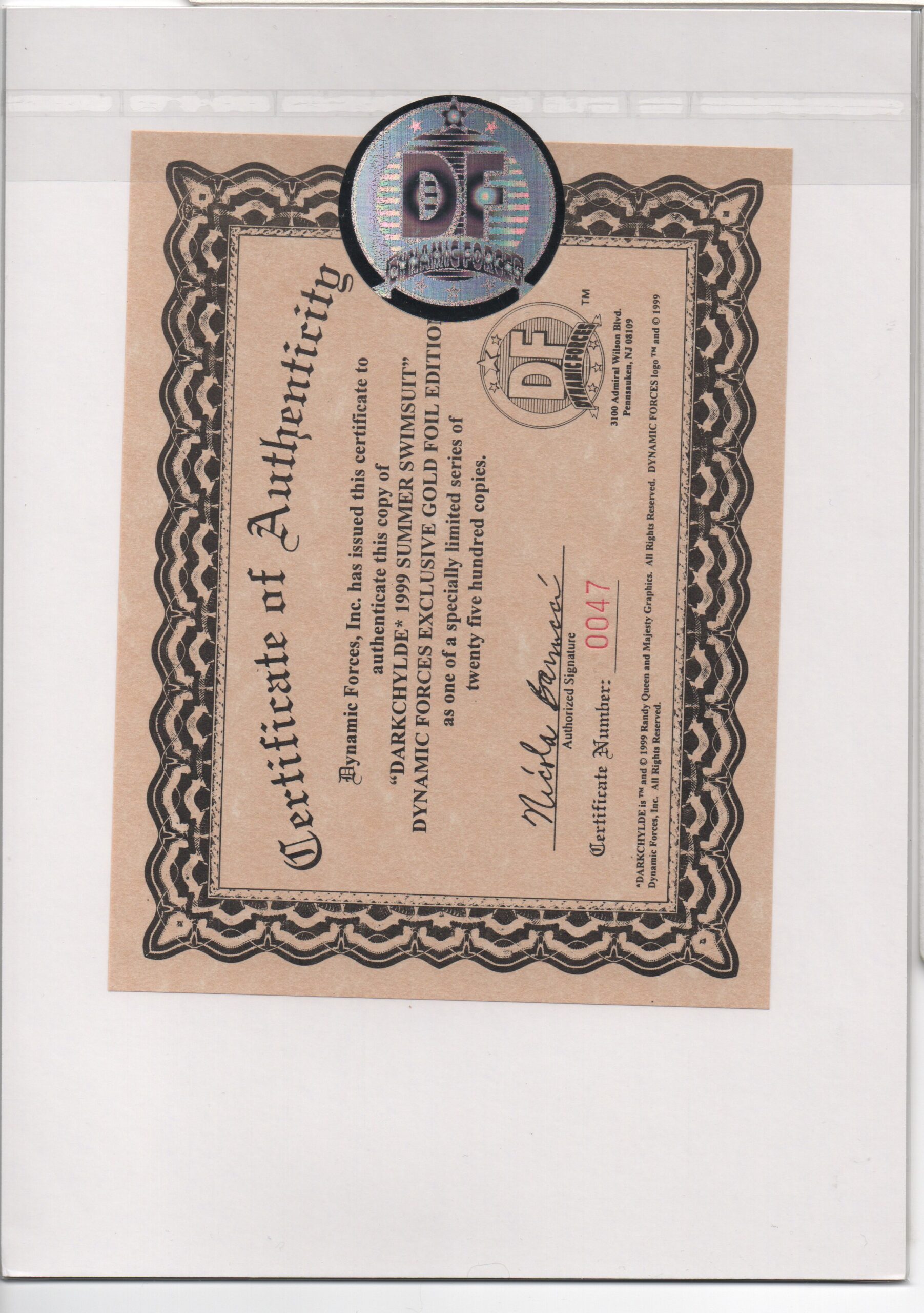 CERTIFICATE OF AUTHENTICITY ISSUED BY DYNAMIC FORCES