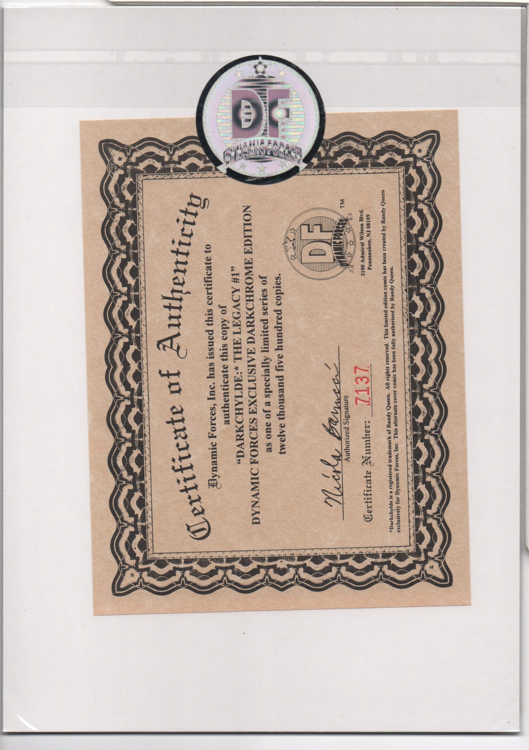 CERTIFICATE OF AUTHENTICITY ISSUED BY DYNAMIC FORCES