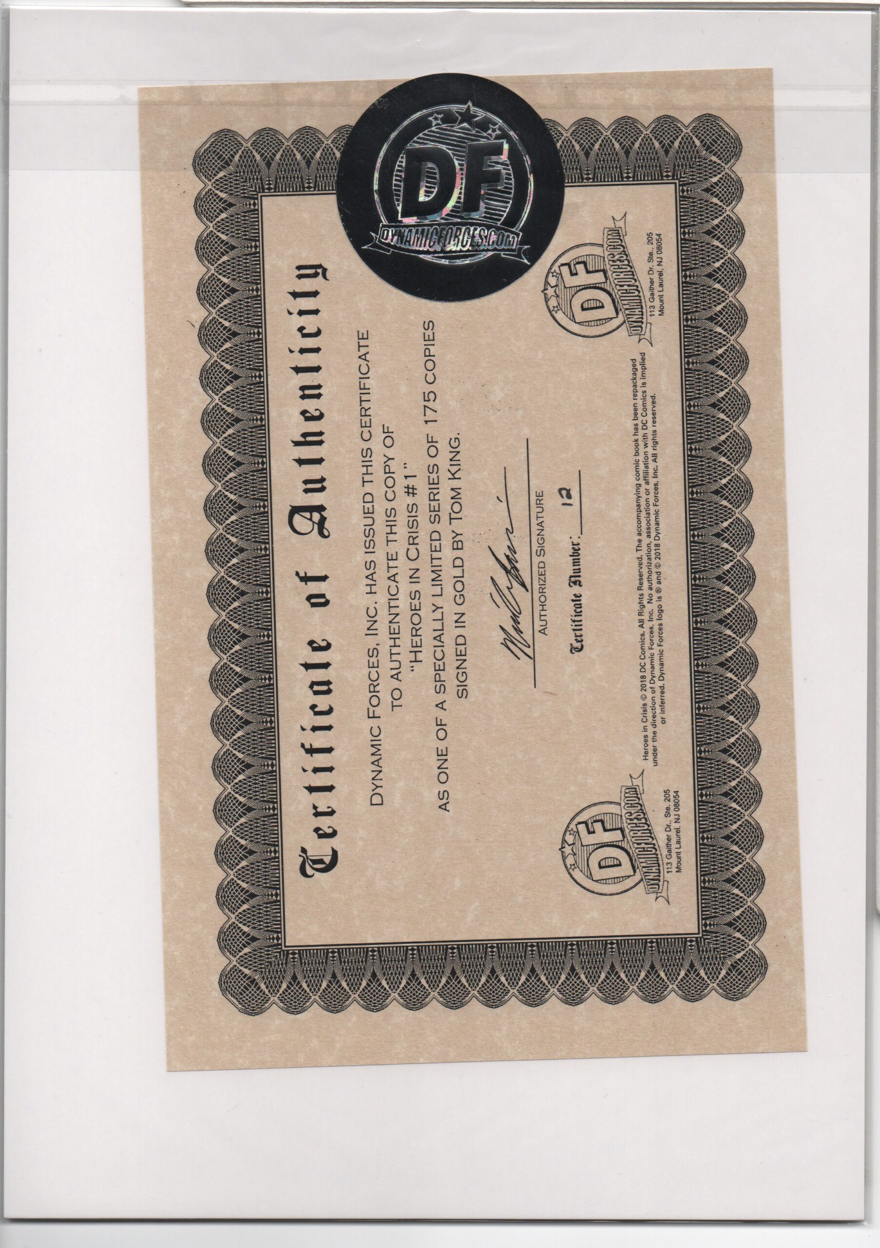 HEROES IN CRISIS #1 – GOLD SIGNATURE SERIES – TOM KING – NUMBERED – WITH DYNAMIC FORCES COA