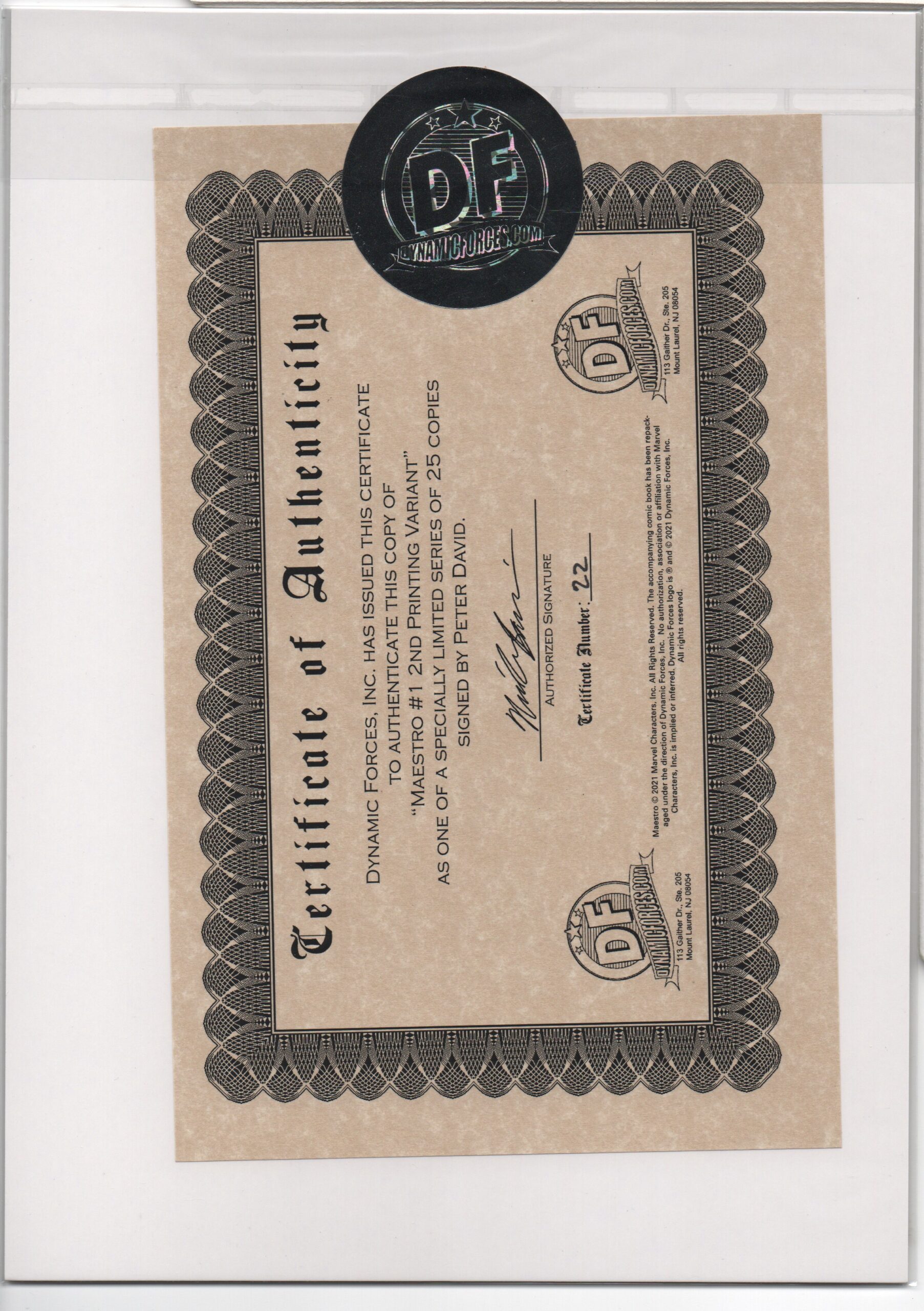 CERTIFICATE OF AUTHENTICITY ISSUED BY DYNAMIC FORCES