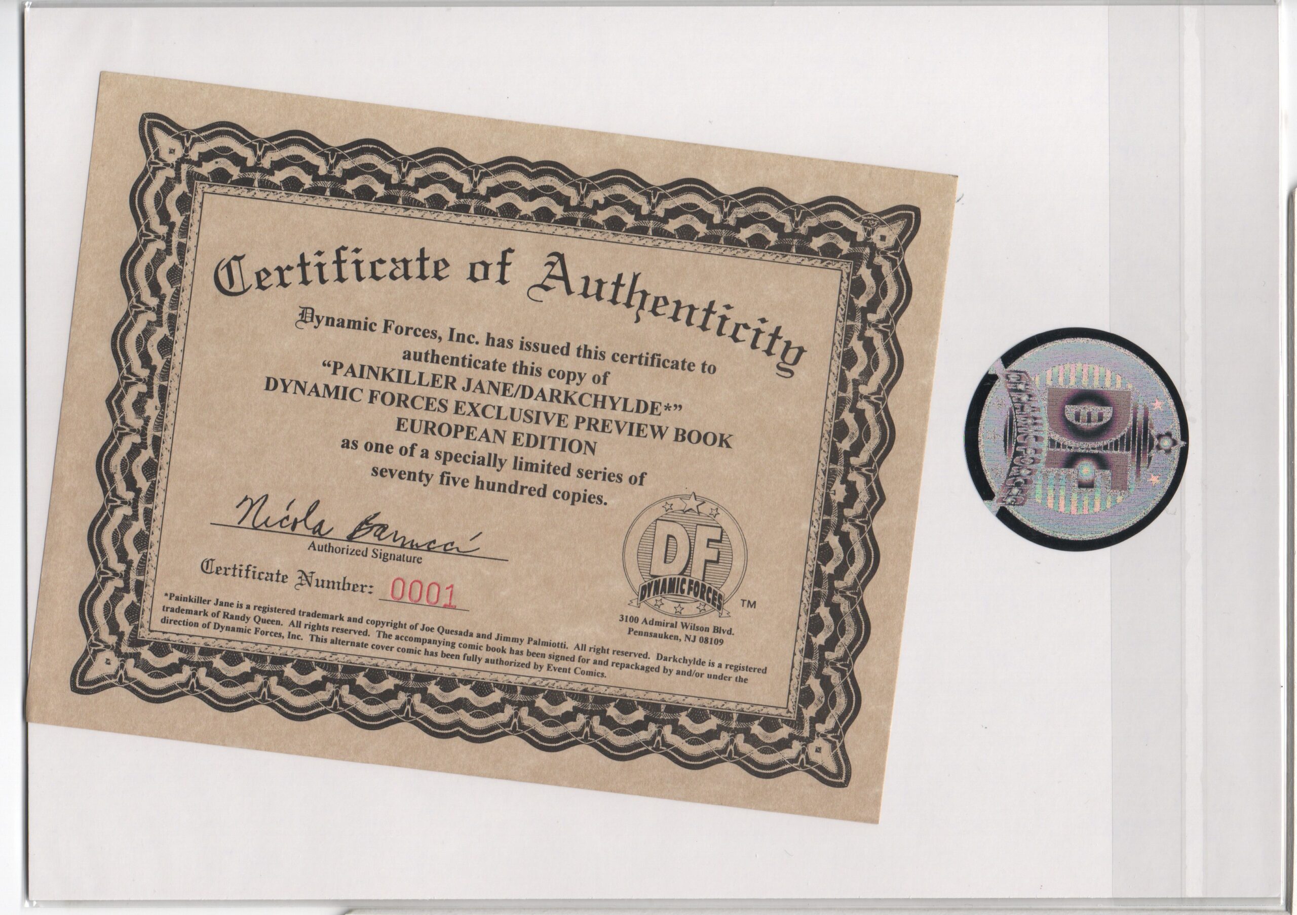 CERTIFICATE OF AUTHENTICITY ISSUED BY DYNAMIC FORCES