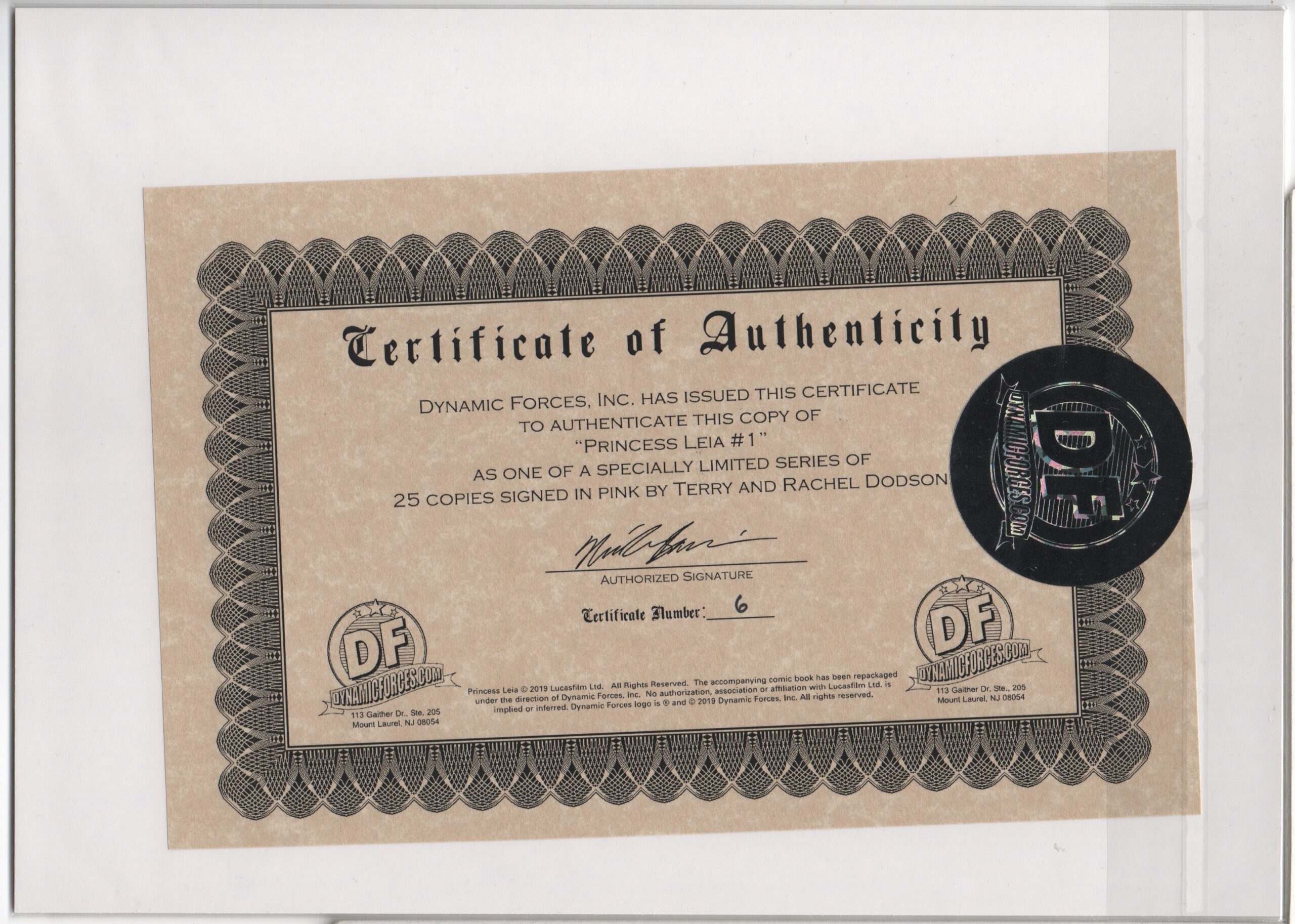 CERTFICATE OF AUTHENTICITY ISSUED BY DYNAMITE ENTERTAINMENT