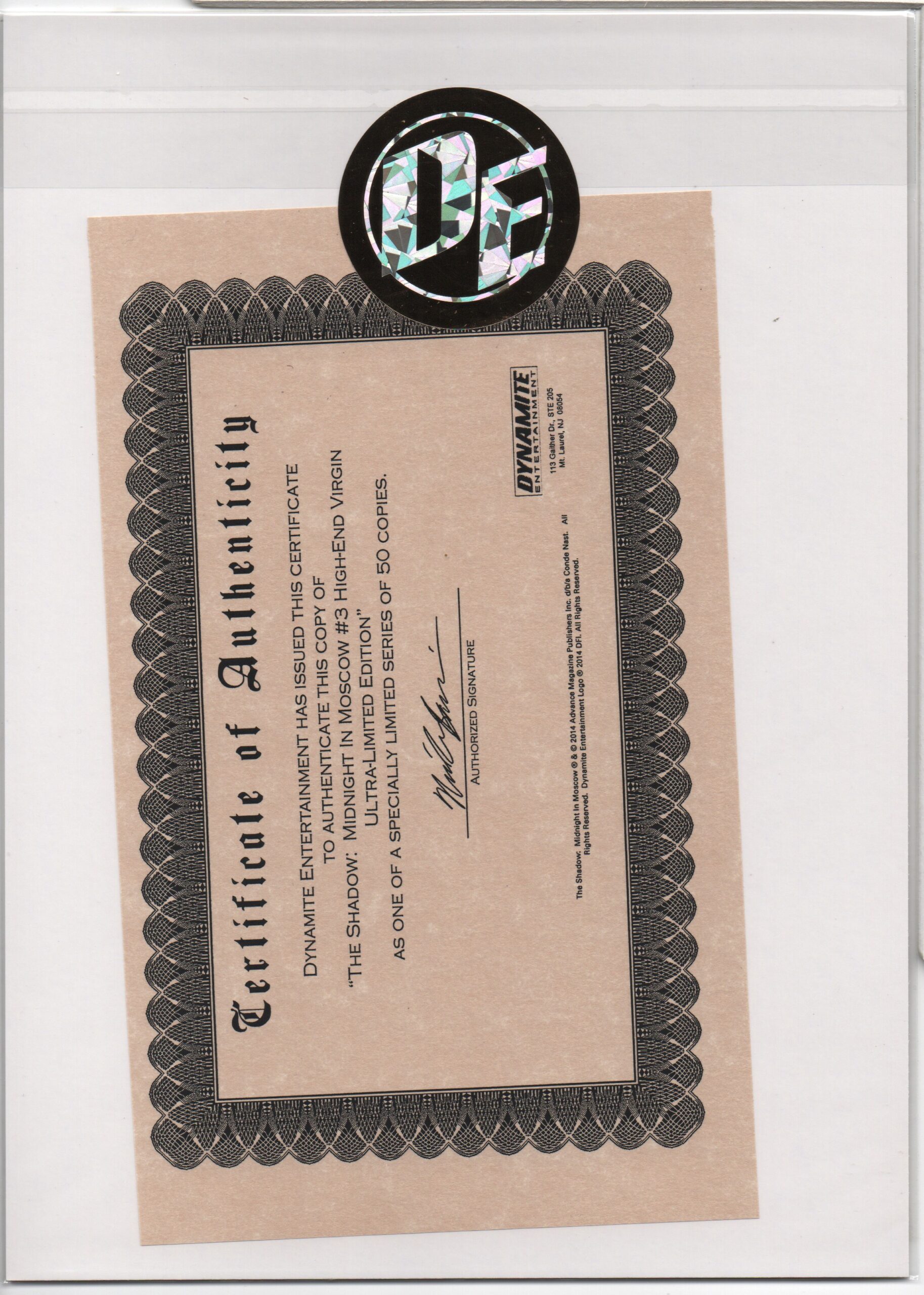 CERTIFICATE OF AUTHENTICITY ISSUED BY DYNAMITE ENTERTAINMENT