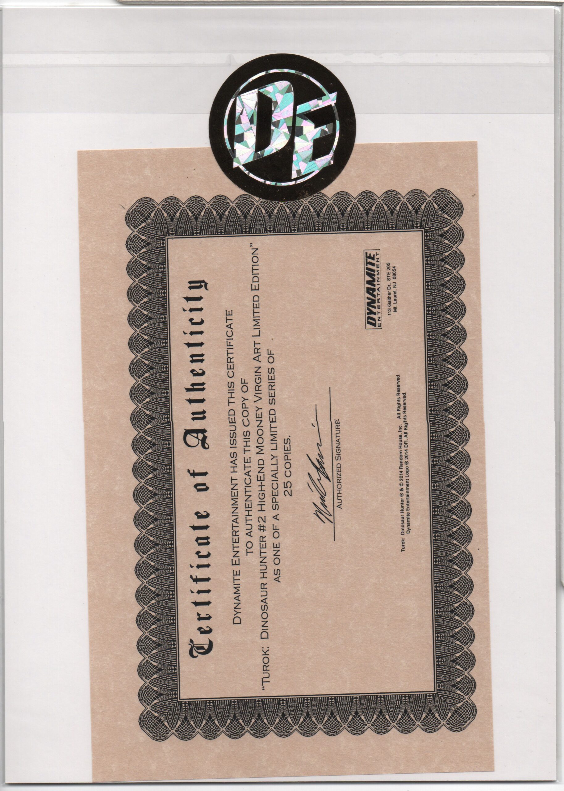 CERTIFICATE OF AUTHENTICITY ISSUED BY DYNAMITE ENTERTAINMENT
