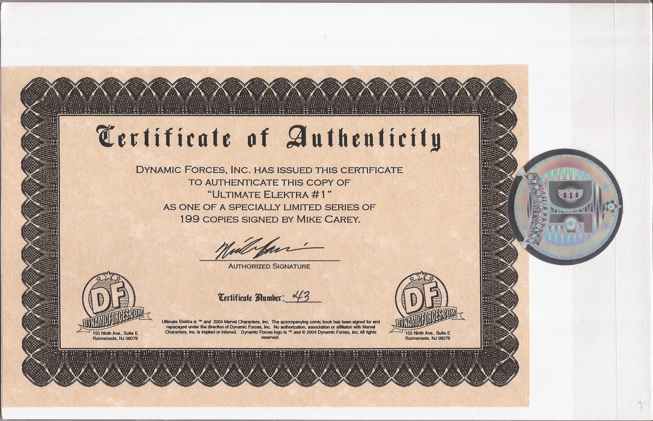 ULTIMATE ELEKTRA #1 – SIGNED MIKE CAREY – NUMBERED COA 043/199 – DEVIL’S DUE – DAREDEVIL
