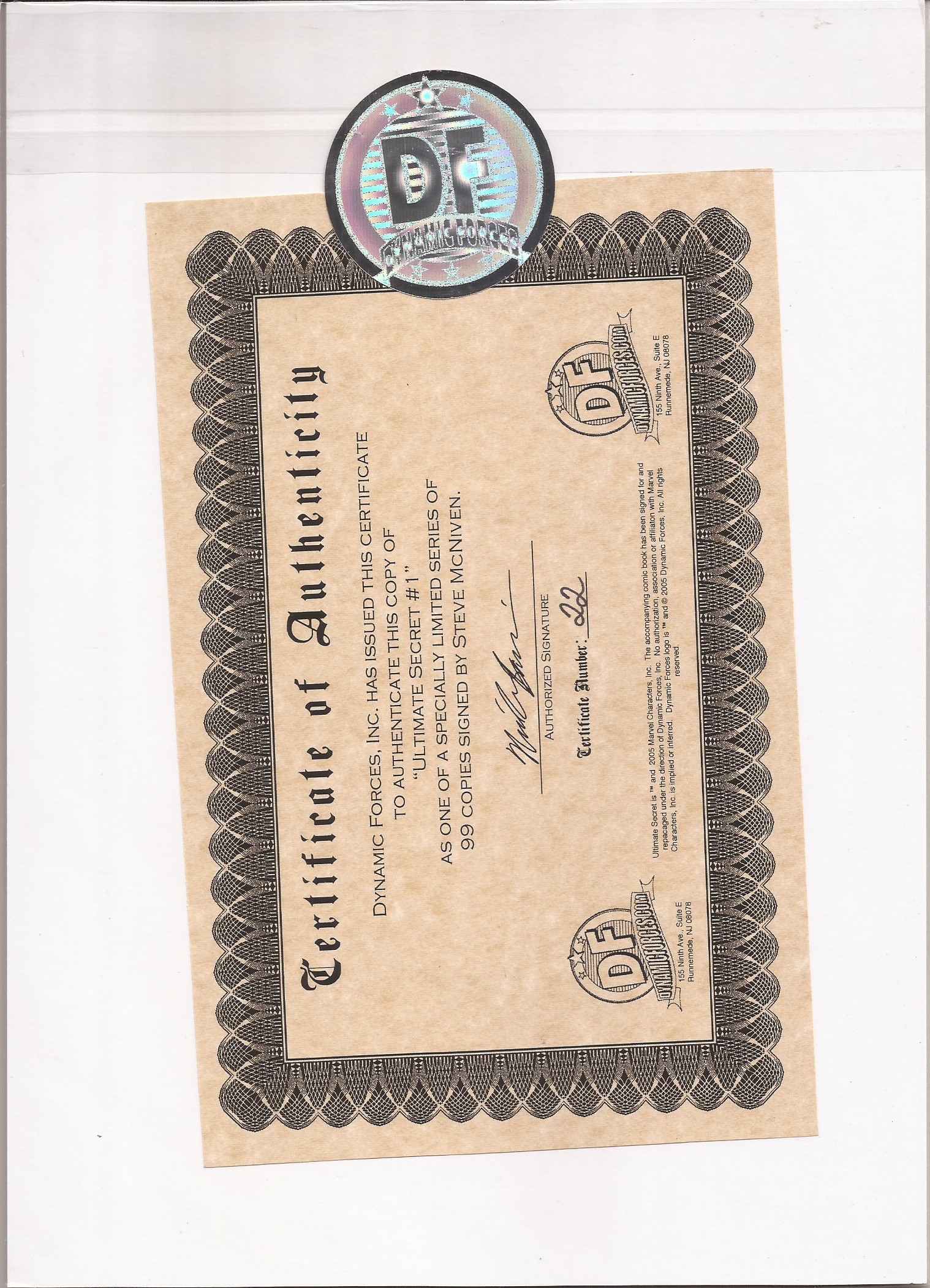 CERTIFICATE OF AUTHENTICITY ISSUED BY DYNAMIC FORCES