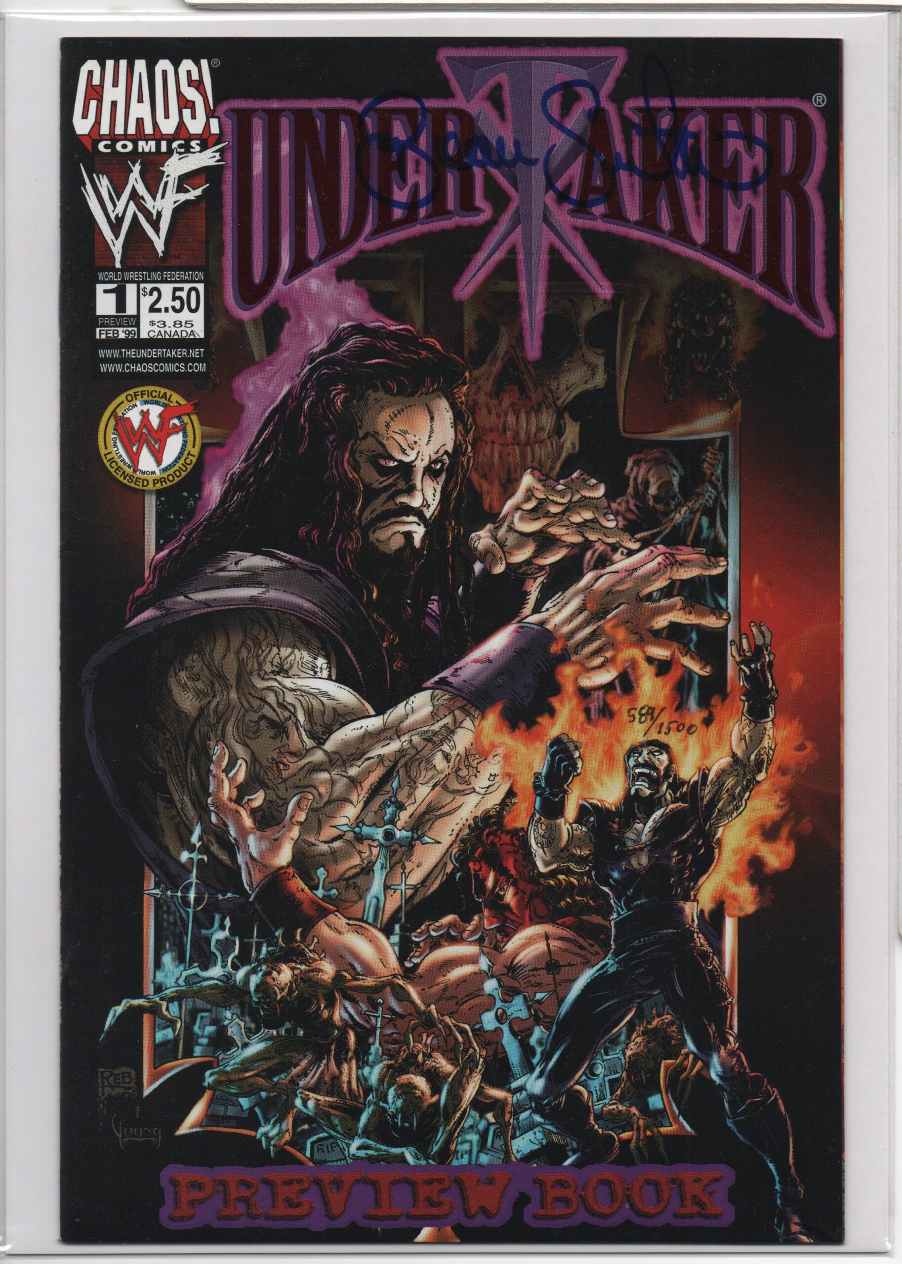 STORYLINE – The February 1999 issue of Undertaker Preview #1 by Chaos! Comics is a one-shot promotional comic introducing The Undertaker into the Chaos! Comics universe. It features preview stories, character art, and multiple variant covers (including photo, art, foil, and signed editions), setting the stage for the full Undertaker series later in 1999. Introduced WWF’s The Undertaker character into comic form, blending wrestling mythology with Chaos! Comics’ supernatural style.